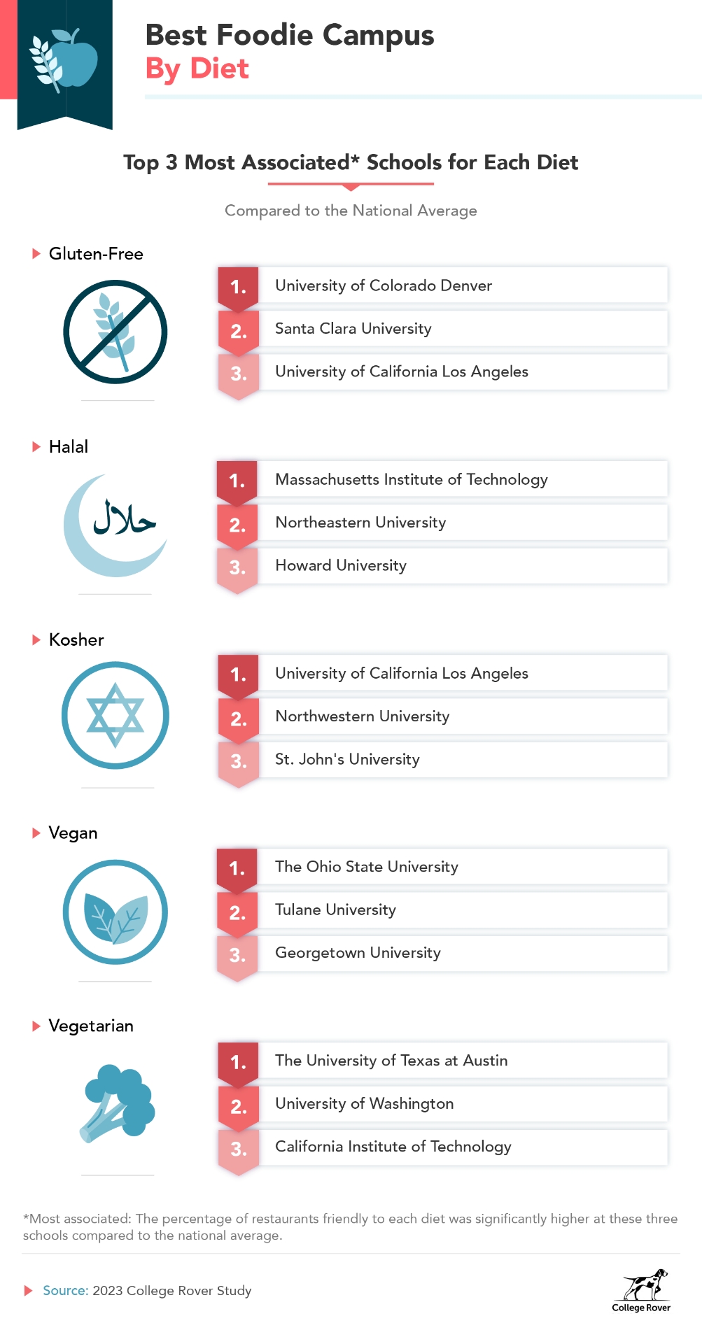 Pursuing higher education doesn't mean you have to leave your chosen diet in the rearview. Let's check out the top three schools for various specialty diets.