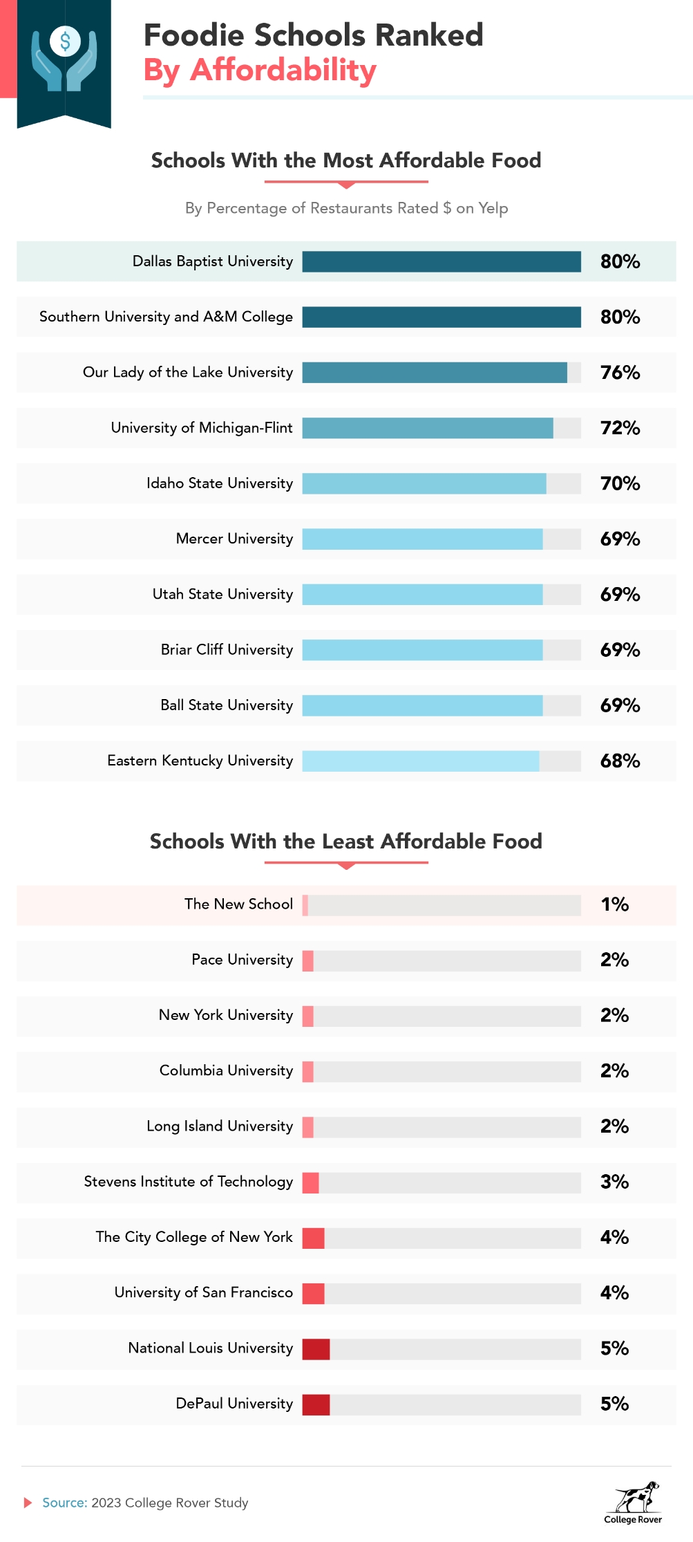 The South doesn't mess around when it comes to great food, which is likely why you'll find plenty of affordable restaurants near Dallas Baptist University, Southern University and A&M College, and Our Lady of the Lake University. The Midwest also offered bunches of budget bites, with the University of Michigan-Flint, Briar Cliff University, and Ball State University among the top 10 schools with the most affordable food.