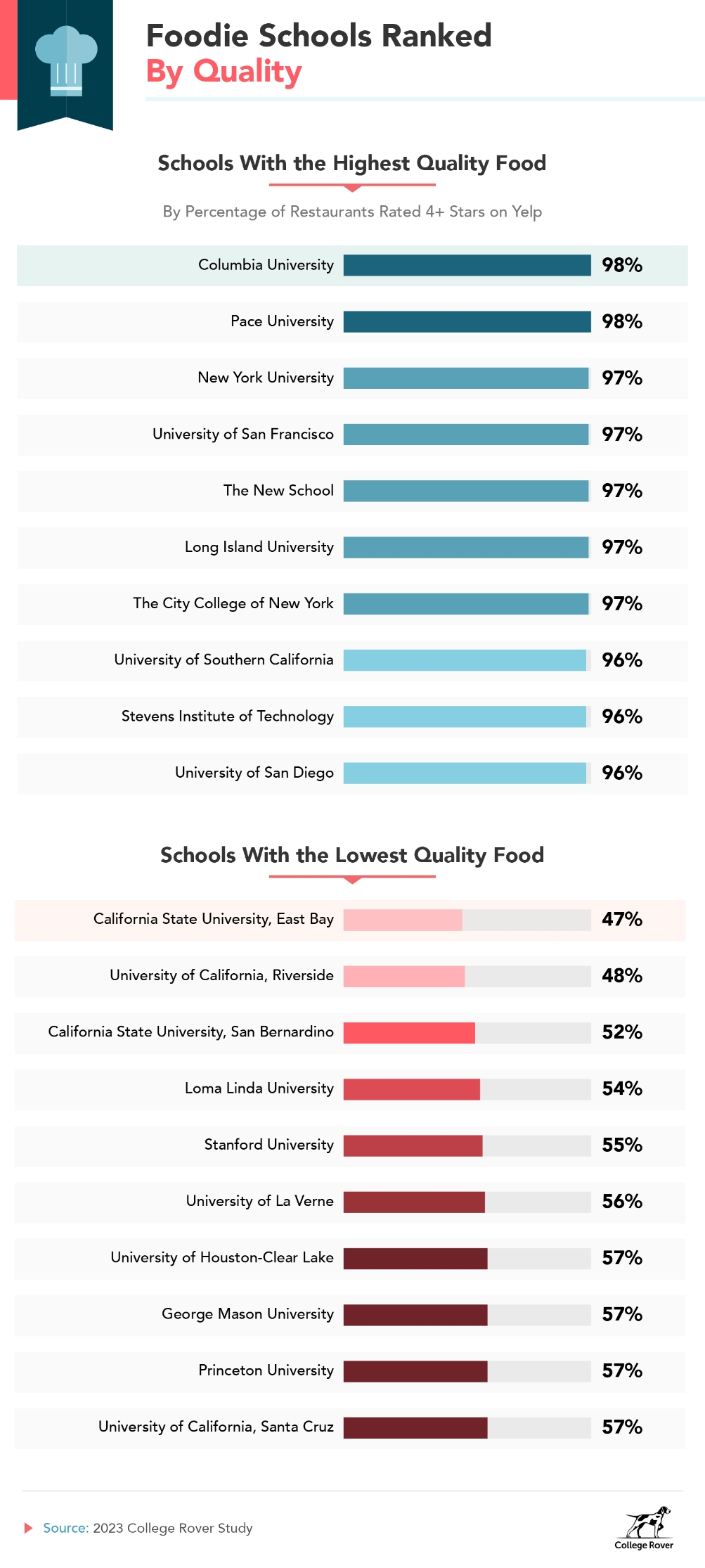 They say you get what you pay for, and that is definitely the case for the pricey food around New York City's schools. Columbia University, Pace University, New York University, The New School, and Long Island University were the top five least affordable schools but ranked among the top six schools with the highest quality food.