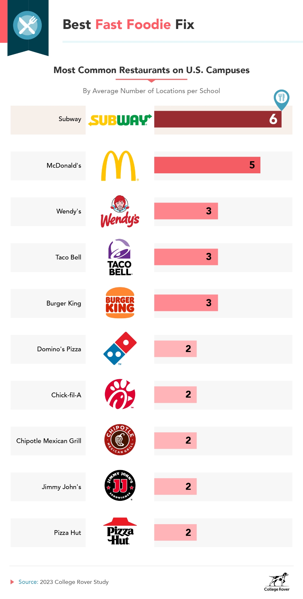 Whether you need fuel for a lengthy study session or the comfort of your favorite hangover meal, sometimes nothing fits the bill like fast food. Subway was the most common fast-food chain, boasting an impressive average of six restaurants per campus. McDonald's wasn't far behind, with an average of five campus locations to satisfy all those Big Mac cravings.