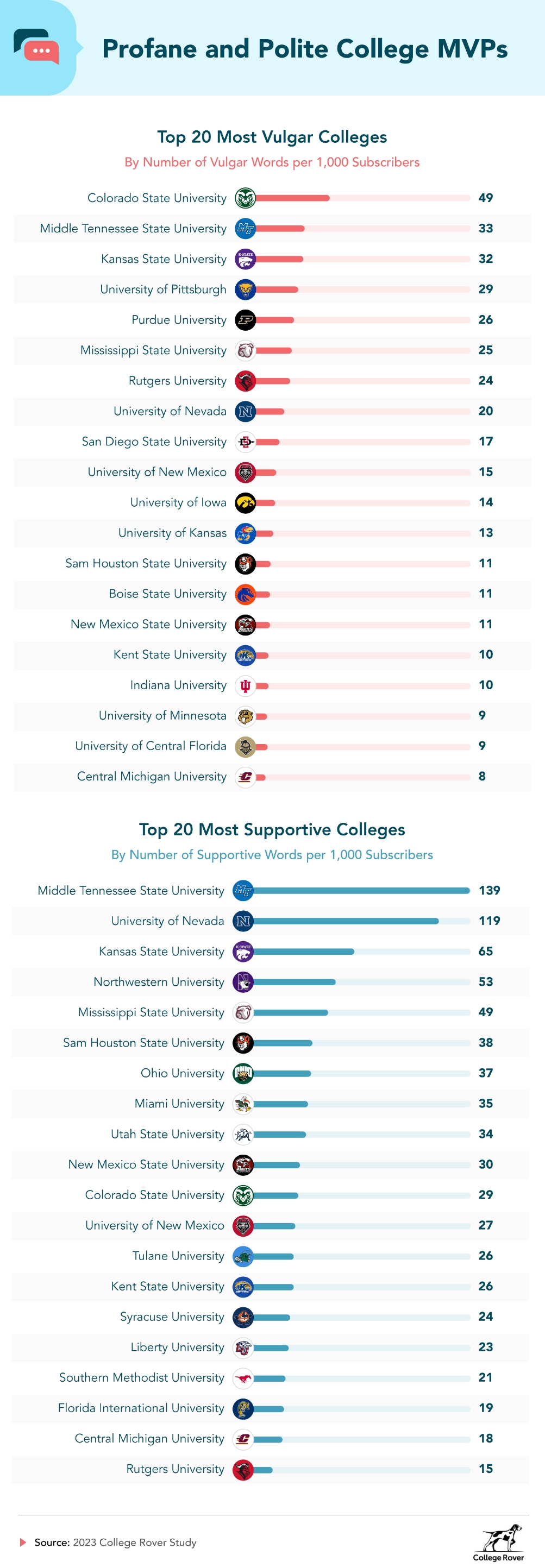 Colorado State University fans were the most vulgar, averaging 49 profane words per 1,000 subscribers. While Middle Tennessee State University was a distant second with 33 offensive words, they were also the most positive fanbase, with an average of 139 supportive words per 1,000 subscribers. Interestingly, eight other schools were also on both top 20 lists, including: