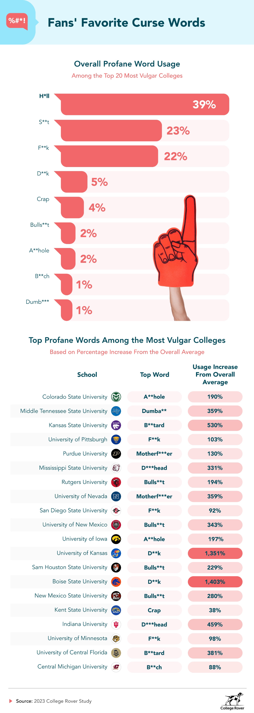 "A**hole" was the most popular curse word for Colorado State University and Kansas State University fans, representing two of the top three most vulgar colleges on our list. Fans of our second-place school, Middle Tennessee State University, preferred the word "dumb***" when expressing their feelings, using it almost 360% more often than average.