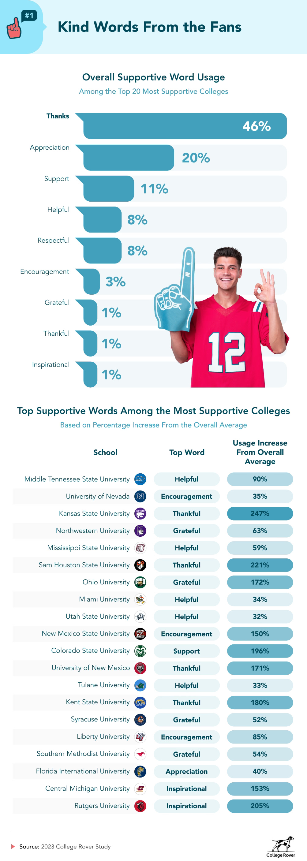"Appreciation" was the next most common supportive word on the list, representing one out of every five positive words. The University of Nevada and Florida International University fans were the most likely to talk about "appreciation" for their teams on their Reddit feeds. Words like "support," "helpful," and "respectful" also made the list of the most popular kind words.