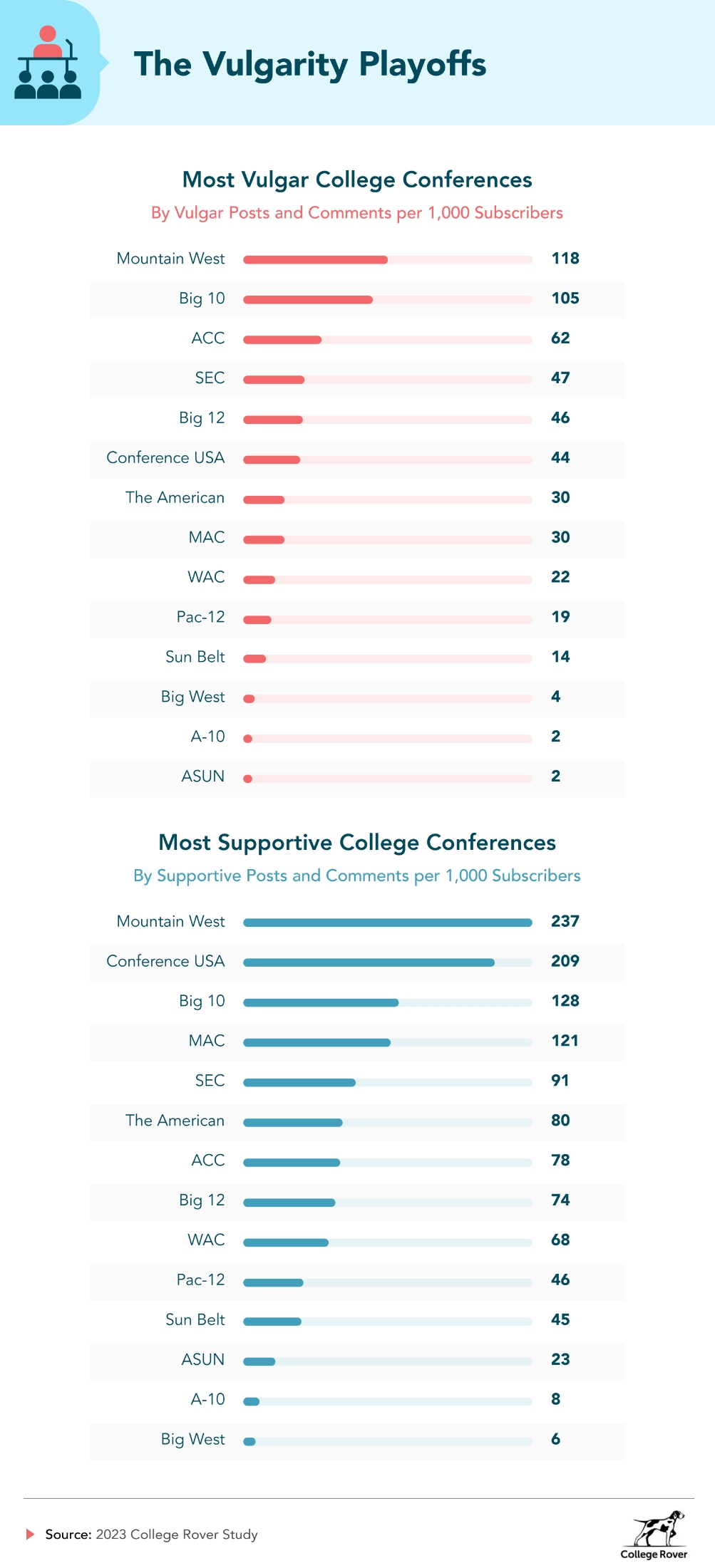 Fans of schools in the Mountain West Conference were both the most vulgar and the most supportive. They used 118 curse words per 1,000 subscribers, but they also used 237 supportive words. Big 10 fans were also active on Reddit, using around 105 vulgar and 128 supportive words per 1,000 subscribers. As you can see, Mountain West fans leaned toward being more supportive, while the Big 10 was only slightly nicer than they were naughty.
